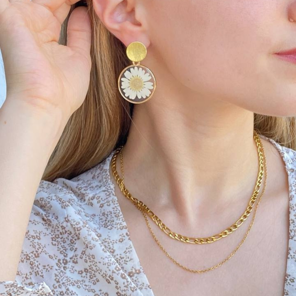 Nuestros Aretes Flor Narciso y en Encaje Floral encapsulan flores secas 100% naturales, dando a cada pieza su propio aspecto único. Hechos a mano con flores prensadas por nosotras mismas,...
